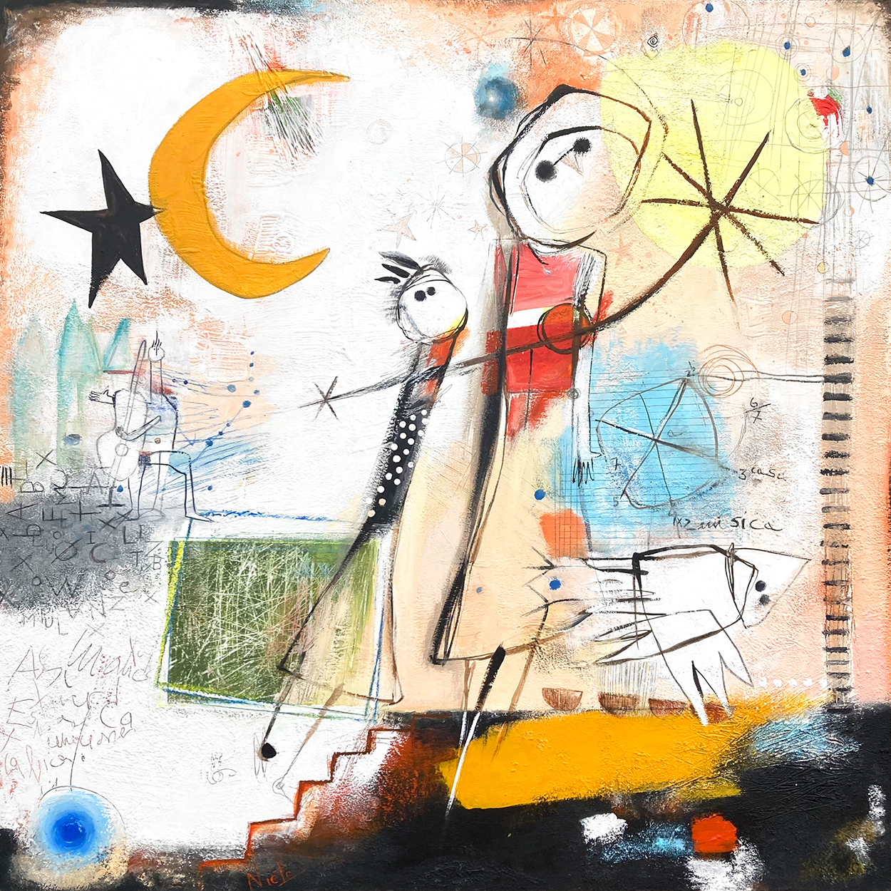 Für Angeles Nieto ist Kunst ein Spiel, ein Gespräch zwischen dem, was gemalt wurde, und dem, was noch zu malen ist, immer auf der Suche nach dem Gleichgewicht. Sie sagt: „Wir sind Staub (Materie) der Sterne. Unsere Körper sind aus der gleichen Materie gemacht, ebenso wie unser geistiges Leben. Gemeinsam sind wir Teil des Universums, wir sind auch Sterne. Die Sterne (Himmelskörper), die Traumwelt oder die Möglichkeit zu fliegen als Ausdruck von Freiheit tauchen oft in meinen Bildern auf.“