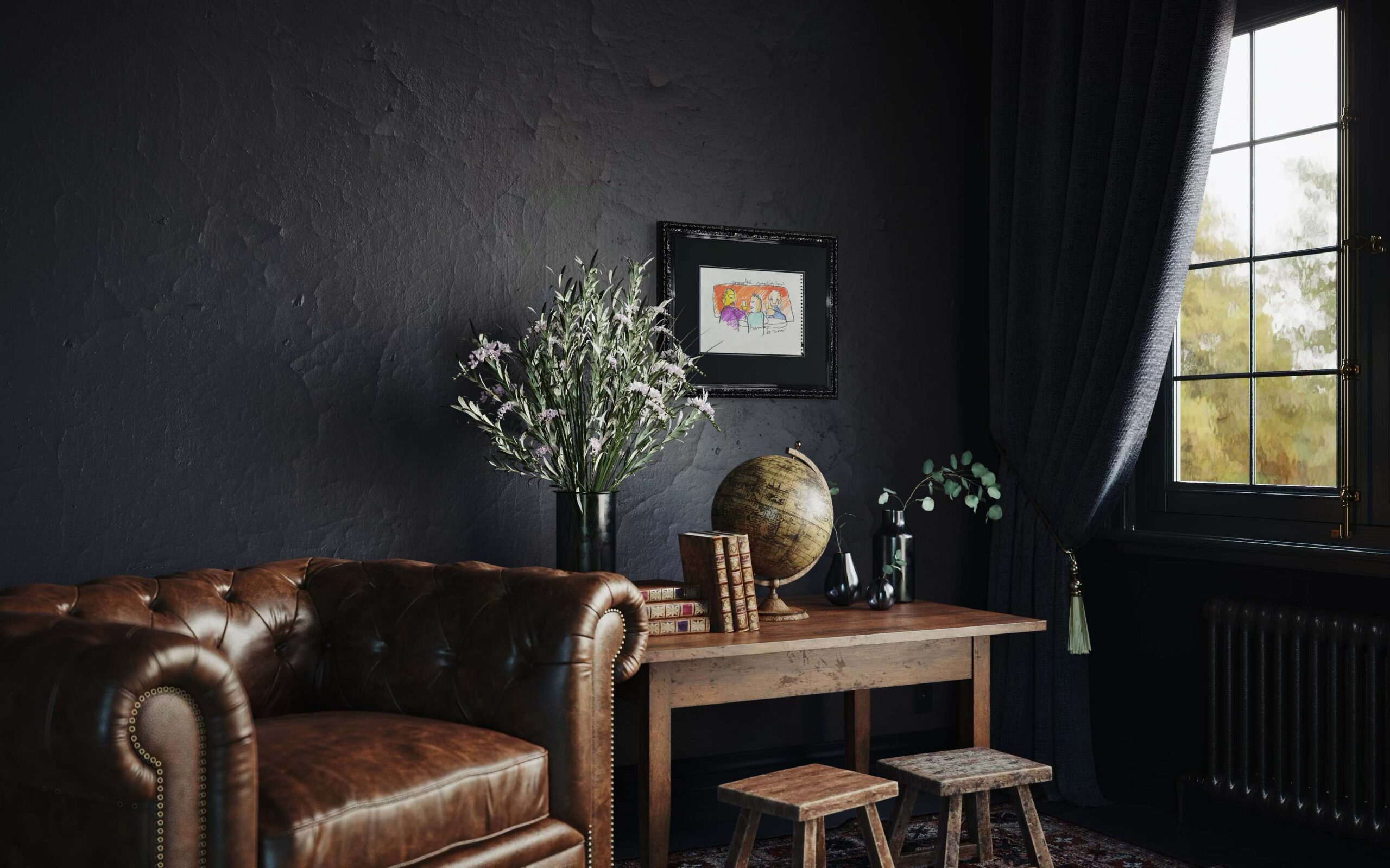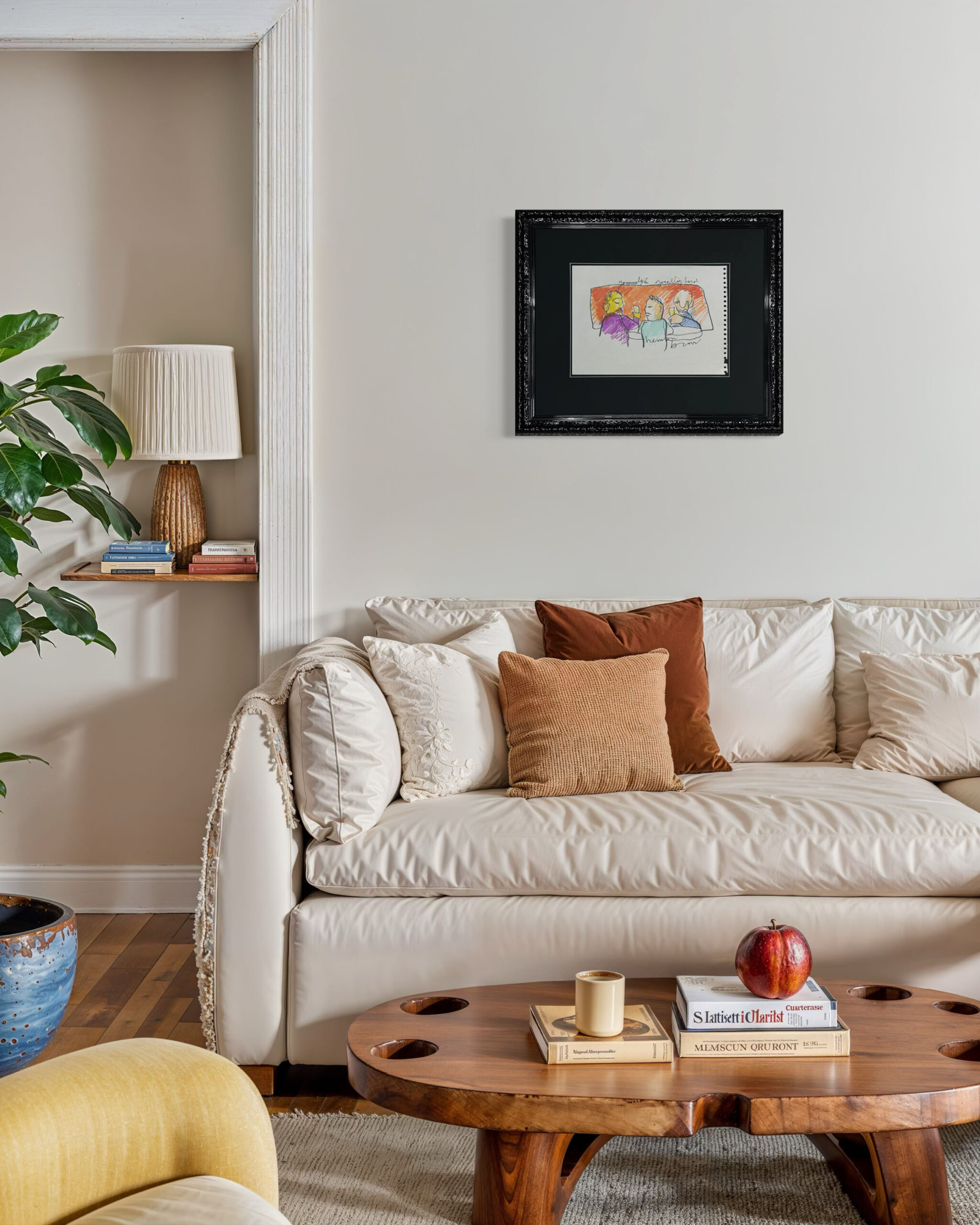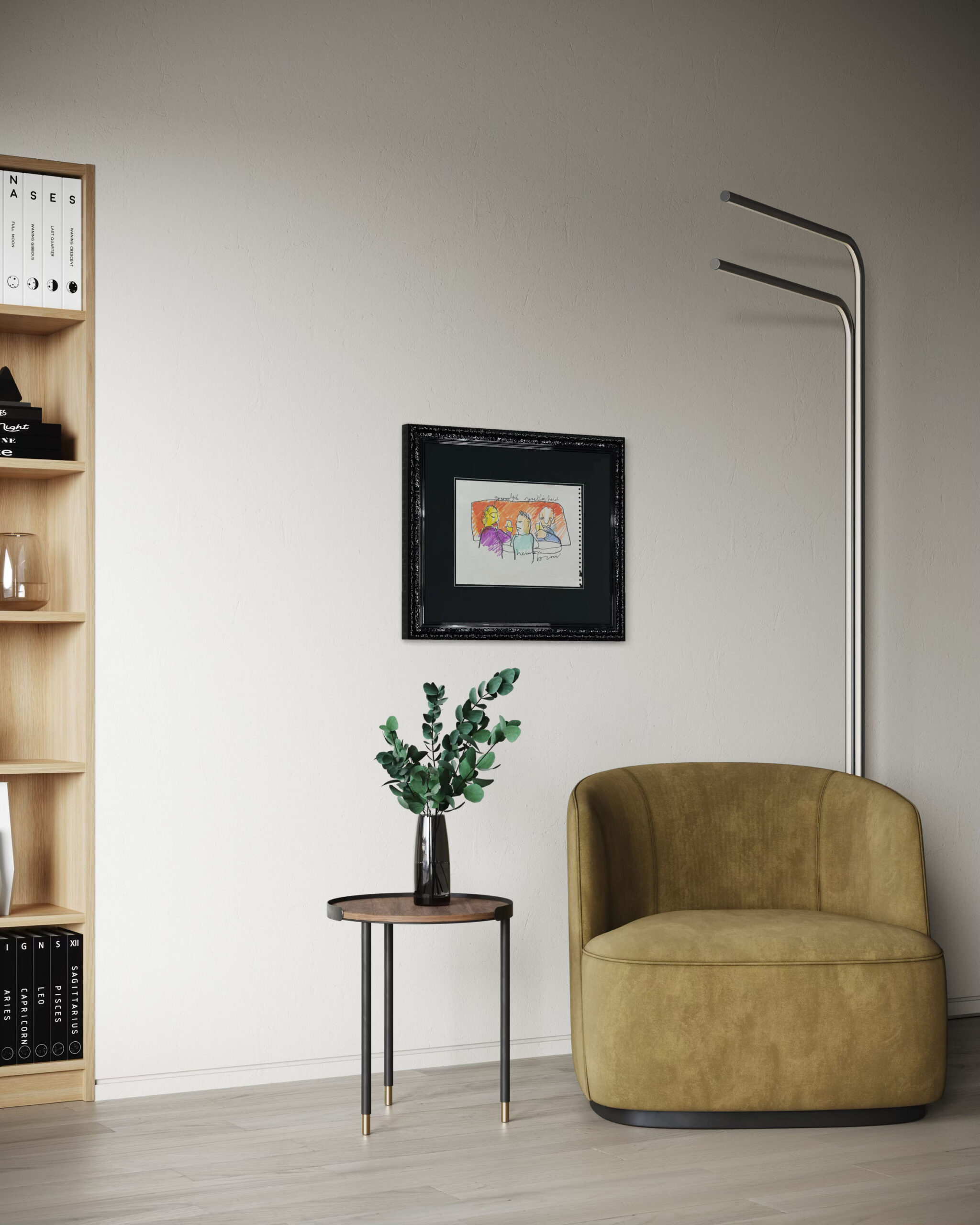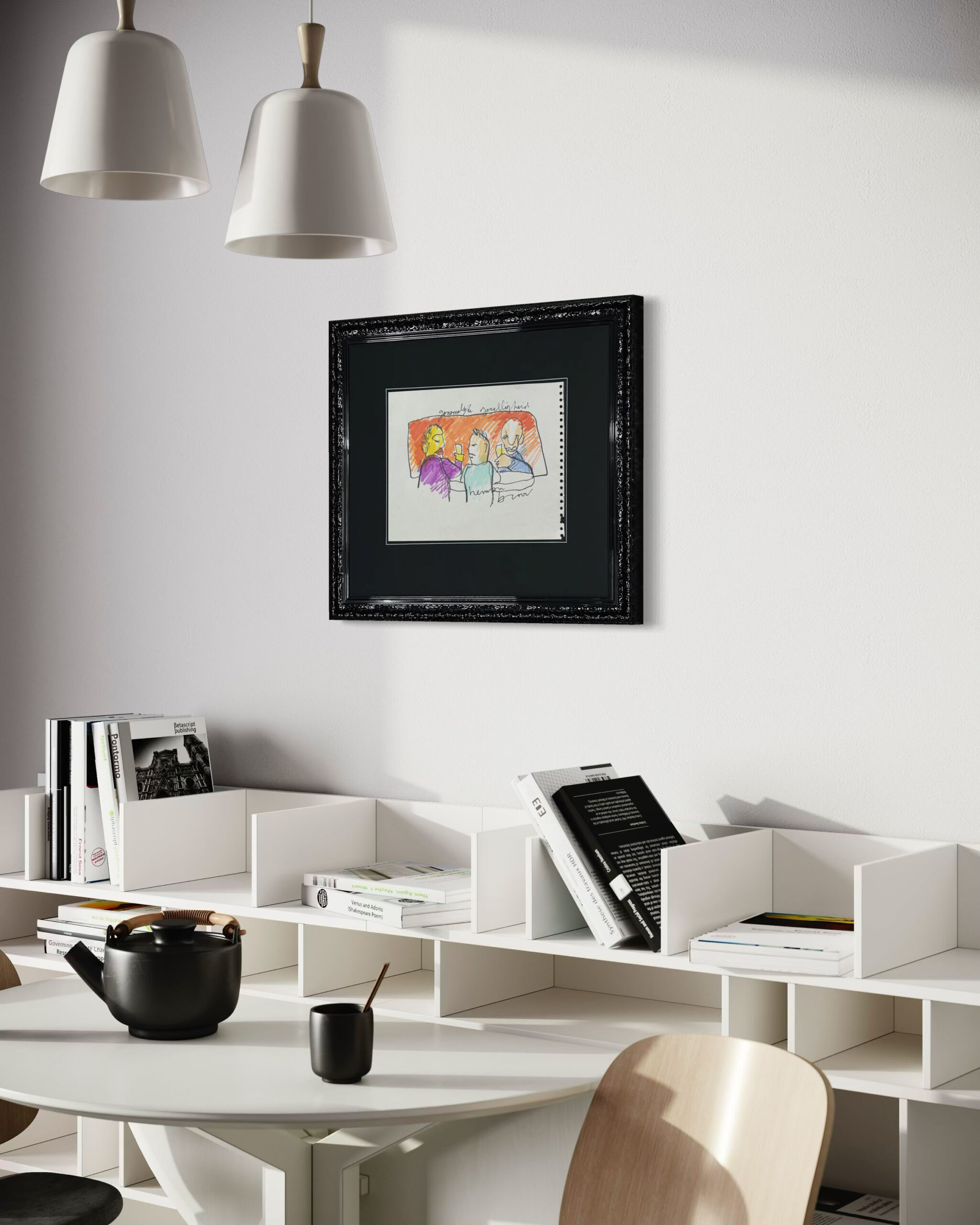 Dieses Kunstwerk verfügt über einen eleganten schwarzen Hochglanz-Ornamentrahmen mit einem säurefreien Passepartout. Die Größe von 61×72 cm beinhaltet den Rahmen. Um die Zeichnung bestmöglich zu schützen und zu bewahren, ist sie mit 99% UV-beständigem Museumsglas ausgestattet. Dadurch wird sichergestellt, dass die Farben und Details des Kunstwerkes erhalten bleiben.