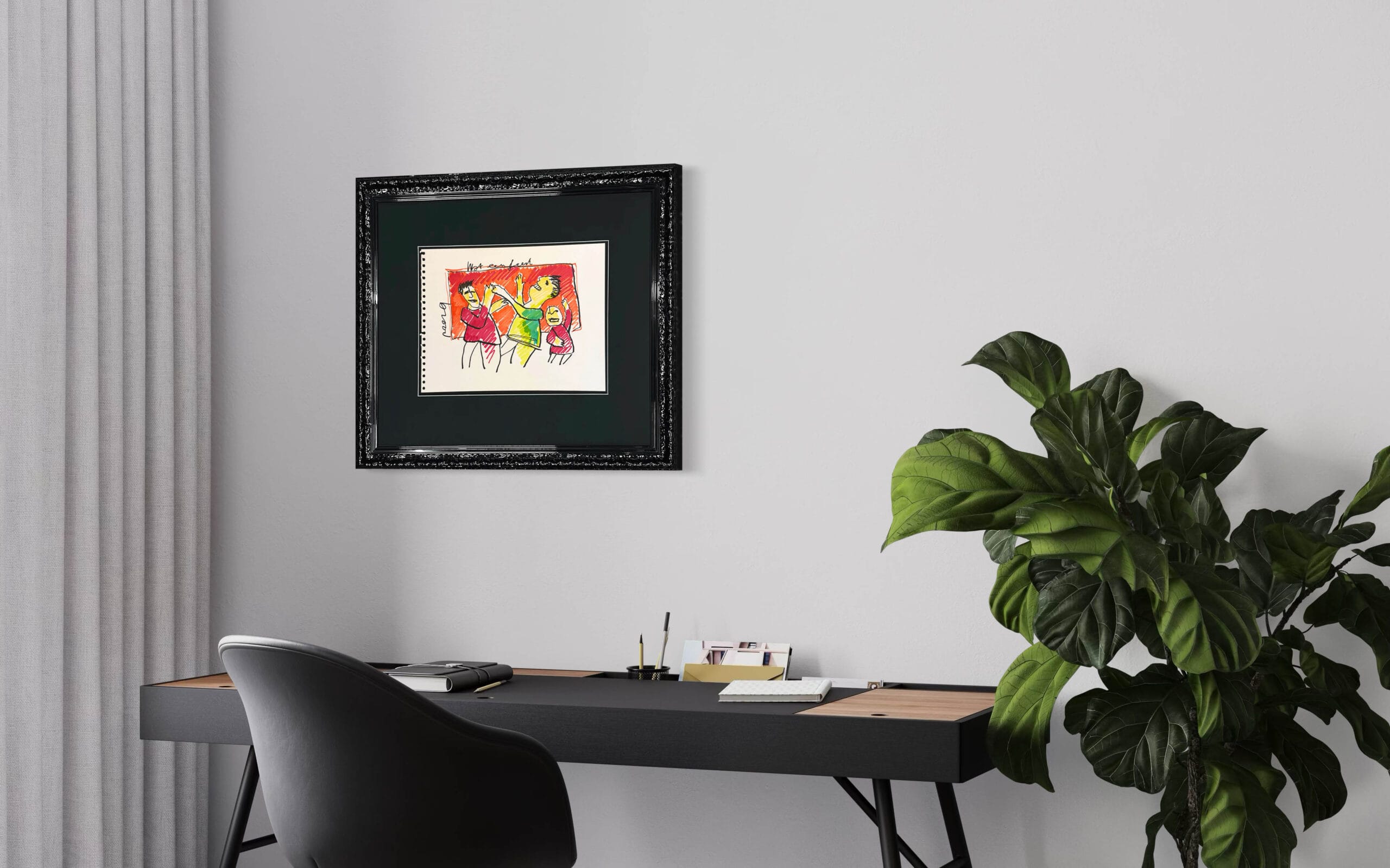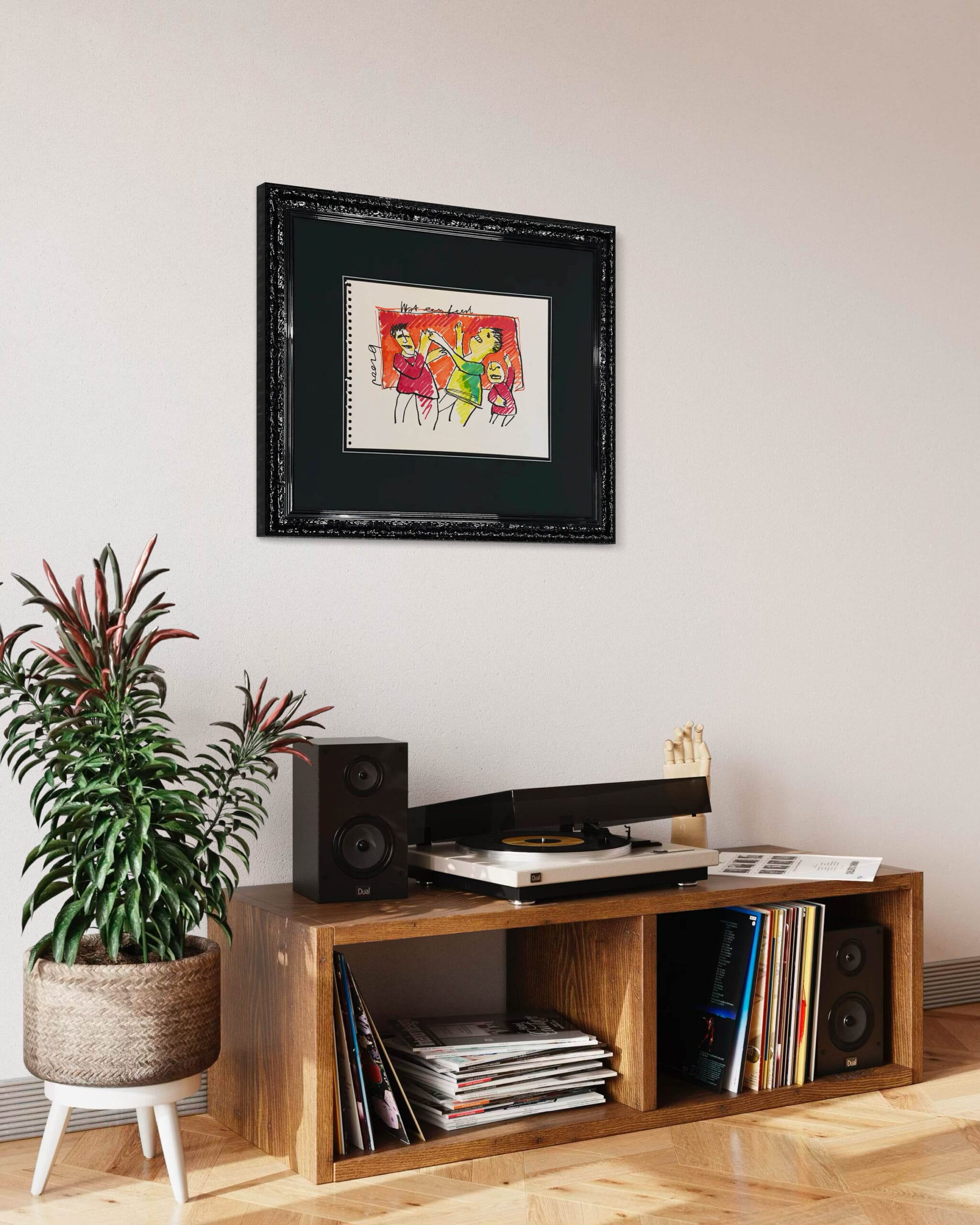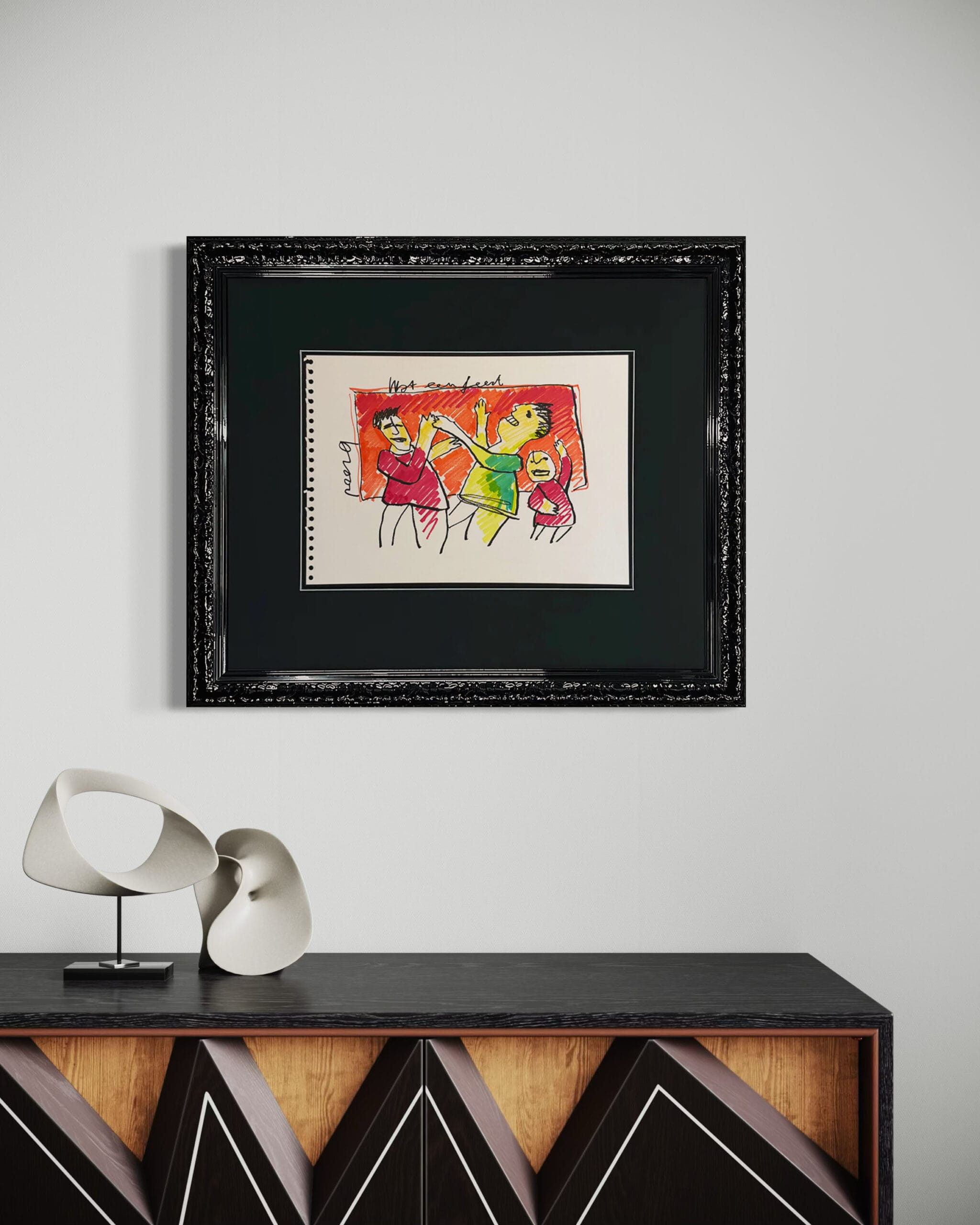 Dieses Kunstwerk verfügt über einen attraktiven schwarzen Hochglanz-Ornamentrahmen mit einem säurefreien Passepartout. Die Größe von 61×72 cm beinhaltet den Rahmen. Um die Zeichnung bestmöglich zu schützen und zu bewahren, ist sie mit 99% UV-beständigem Museumsglas ausgestattet. Dadurch wird sichergestellt, dass die Farben und Details des Kunstwerkes erhalten bleiben. Würden Sie eine andere Liste bevorzugen? Kein Problem. In unserer Galerie haben wir mehr als 1.000 verschiedene Profile.