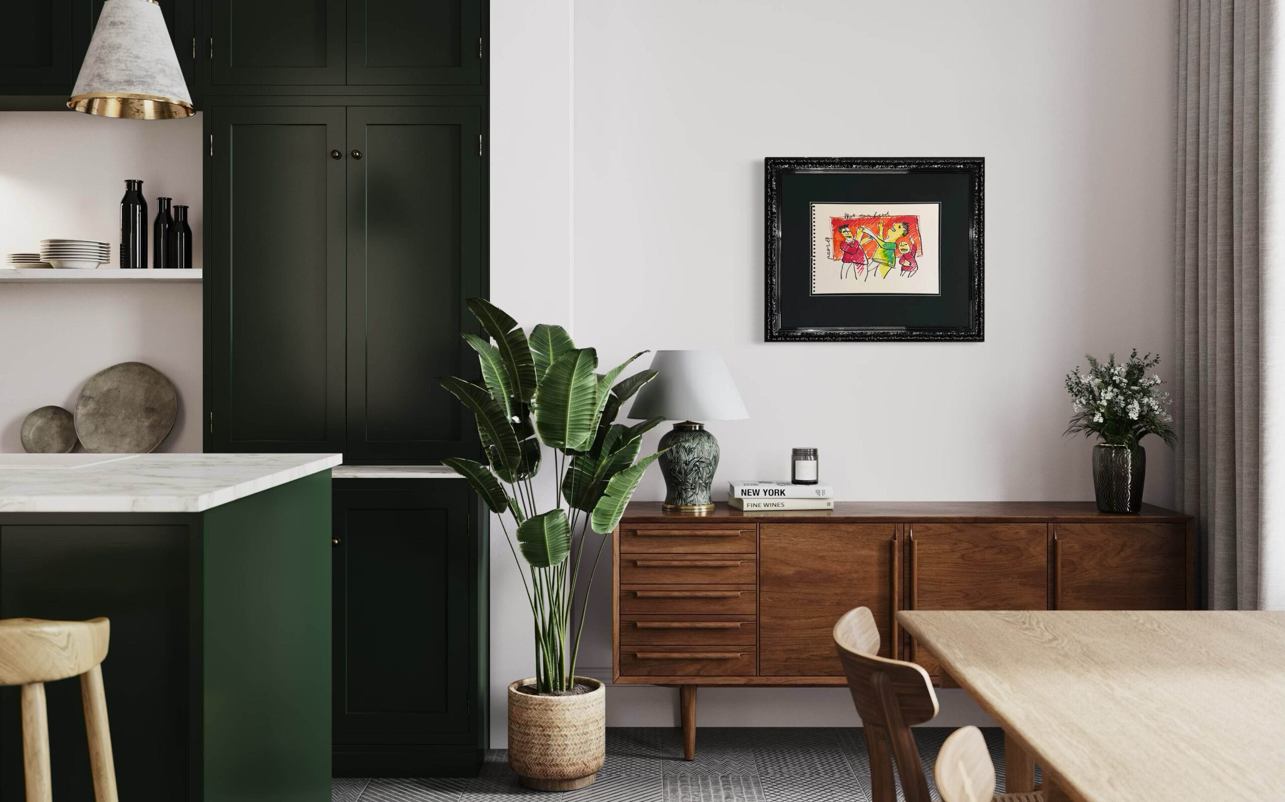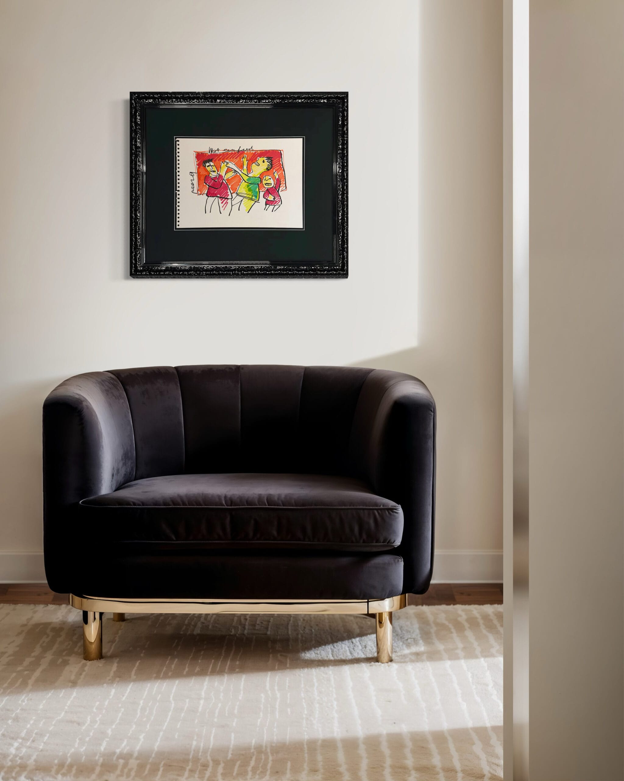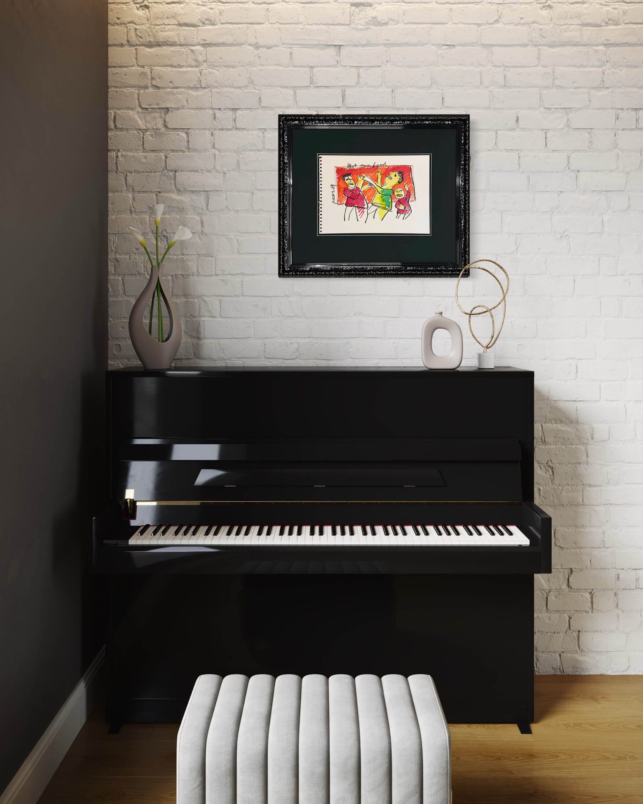 Dieses Kunstwerk verfügt über einen attraktiven schwarzen Hochglanz-Ornamentrahmen mit einem säurefreien Passepartout. Die Größe von 61×72 cm beinhaltet den Rahmen. Um die Zeichnung bestmöglich zu schützen und zu bewahren, ist sie mit 99% UV-beständigem Museumsglas ausgestattet. Dadurch wird sichergestellt, dass die Farben und Details des Kunstwerkes erhalten bleiben. Würden Sie eine andere Liste bevorzugen? Kein Problem. In unserer Galerie haben wir mehr als 1.000 verschiedene Profile.