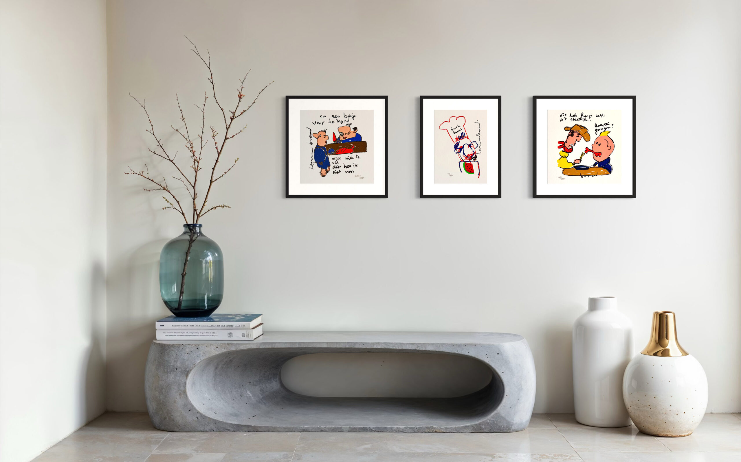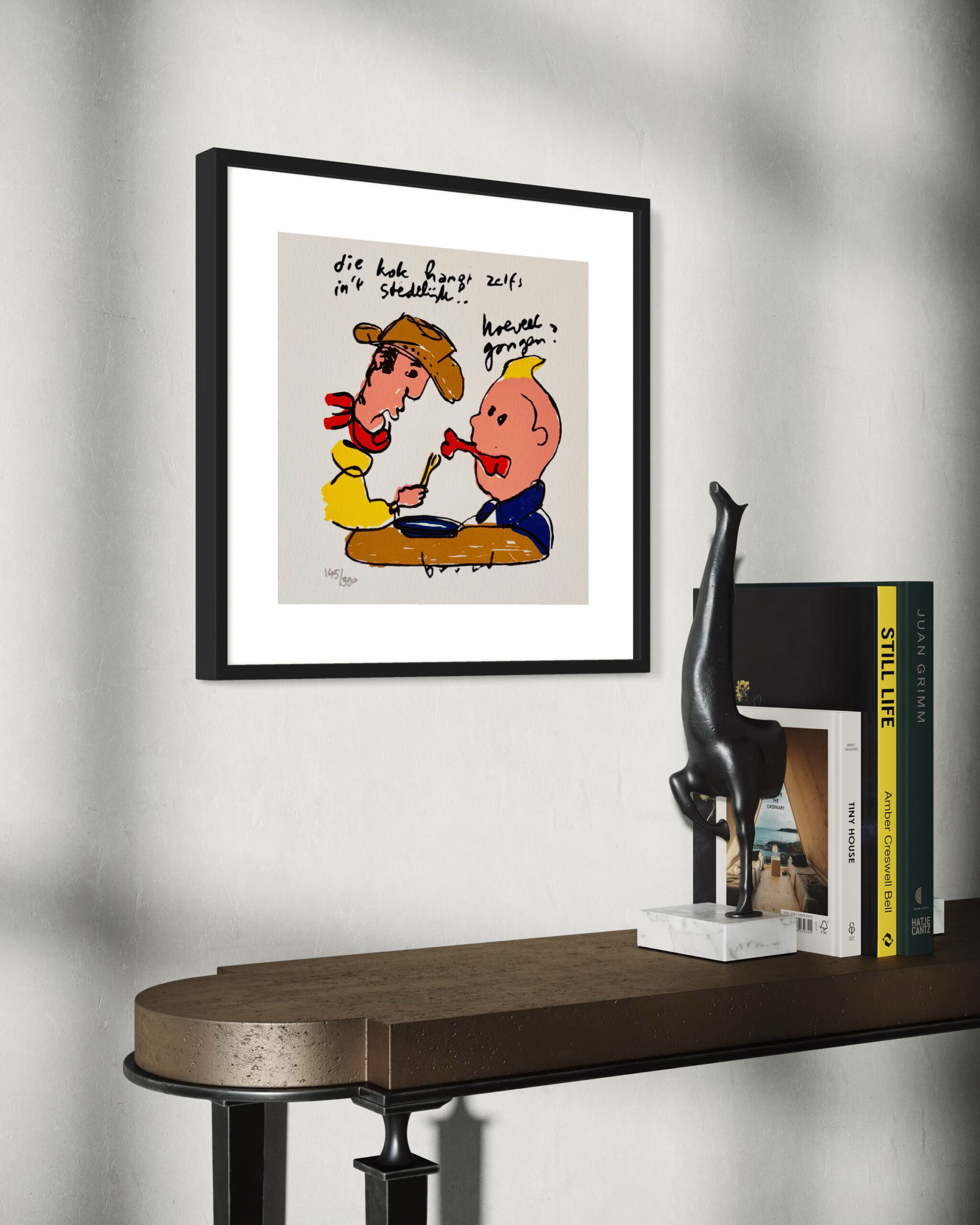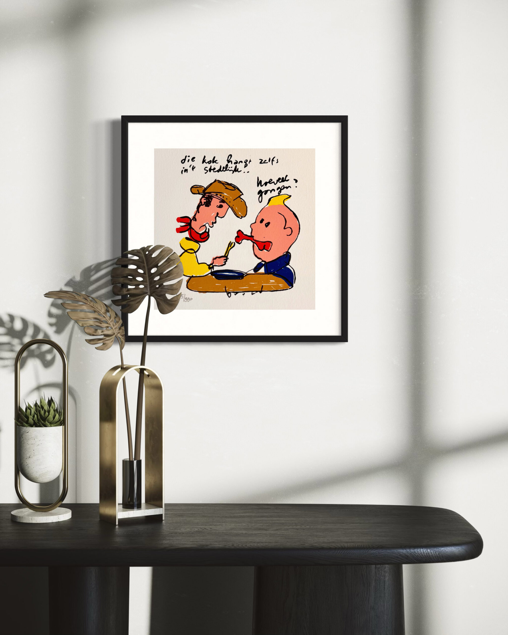 Schöner Siebdruck von Herman Brood. „Der Koch hängt sogar in der Stadt. - Wie viele Gänge?“ Dieses Kunstwerk strahlt den charakteristischen Stil und die Energie von Bread aus und ist perfekt für jeden Kunstliebhaber. Der Originalsiebdruck ist nummeriert und mit einer Signatur versehen. Die Auflage des Siebdrucks beträgt 350 Exemplare. Die Gesamtgröße beträgt 31×31 cm und das Kunstwerk ist in einem ausgezeichneten Zustand. „Die Kok Hangs Even In The Stedelijk“ ist in unserer Galerie vorrätig und kann auch online bestellt werden. Das perfekte Geschenk für jeden Brot- und Kunstliebhaber! Versandkosten in den Niederlanden €8,95 (andere Länder: die Versandkosten werden während des Bestellvorgangs angezeigt). Lieferzeit 1-3 Arbeitstage.