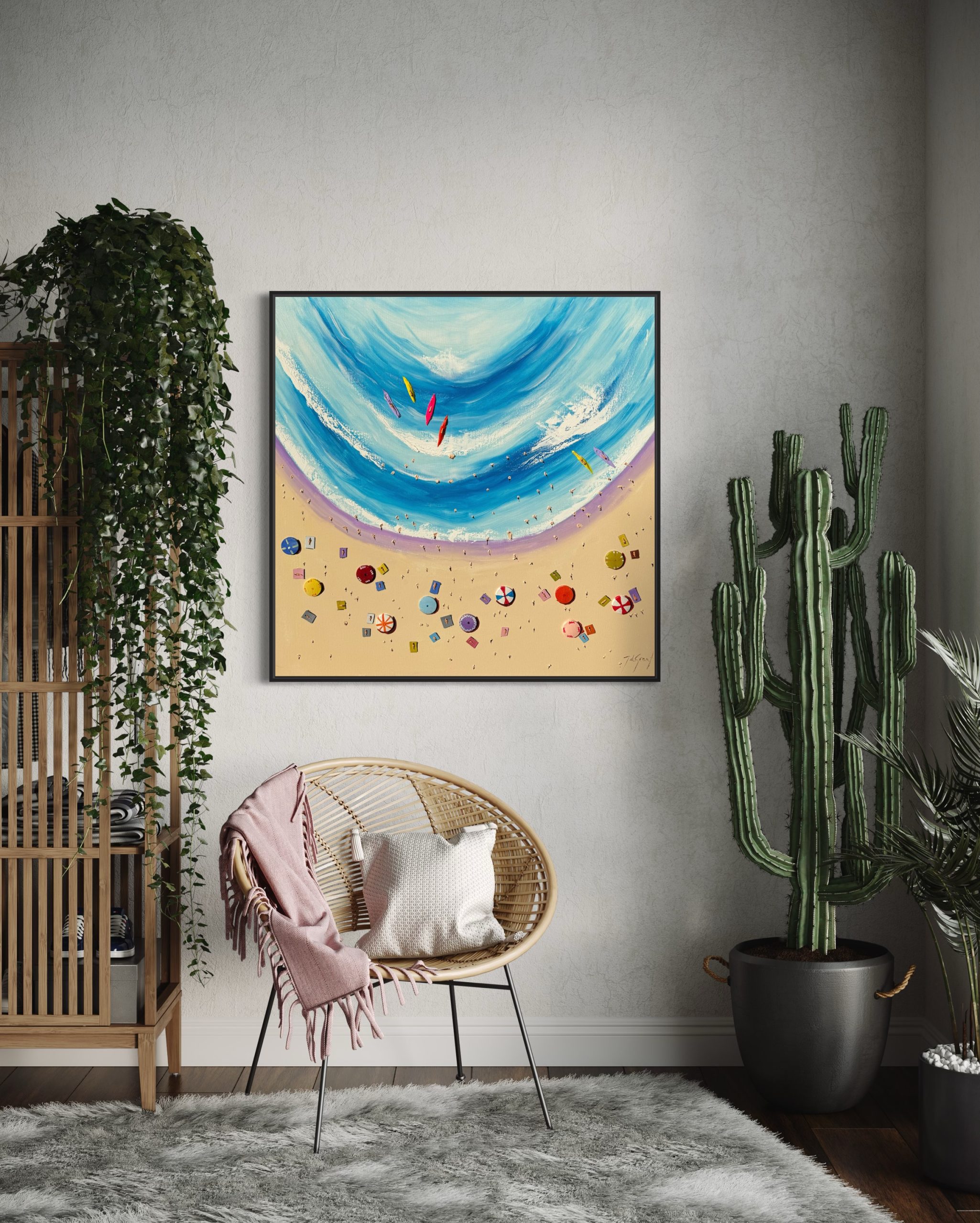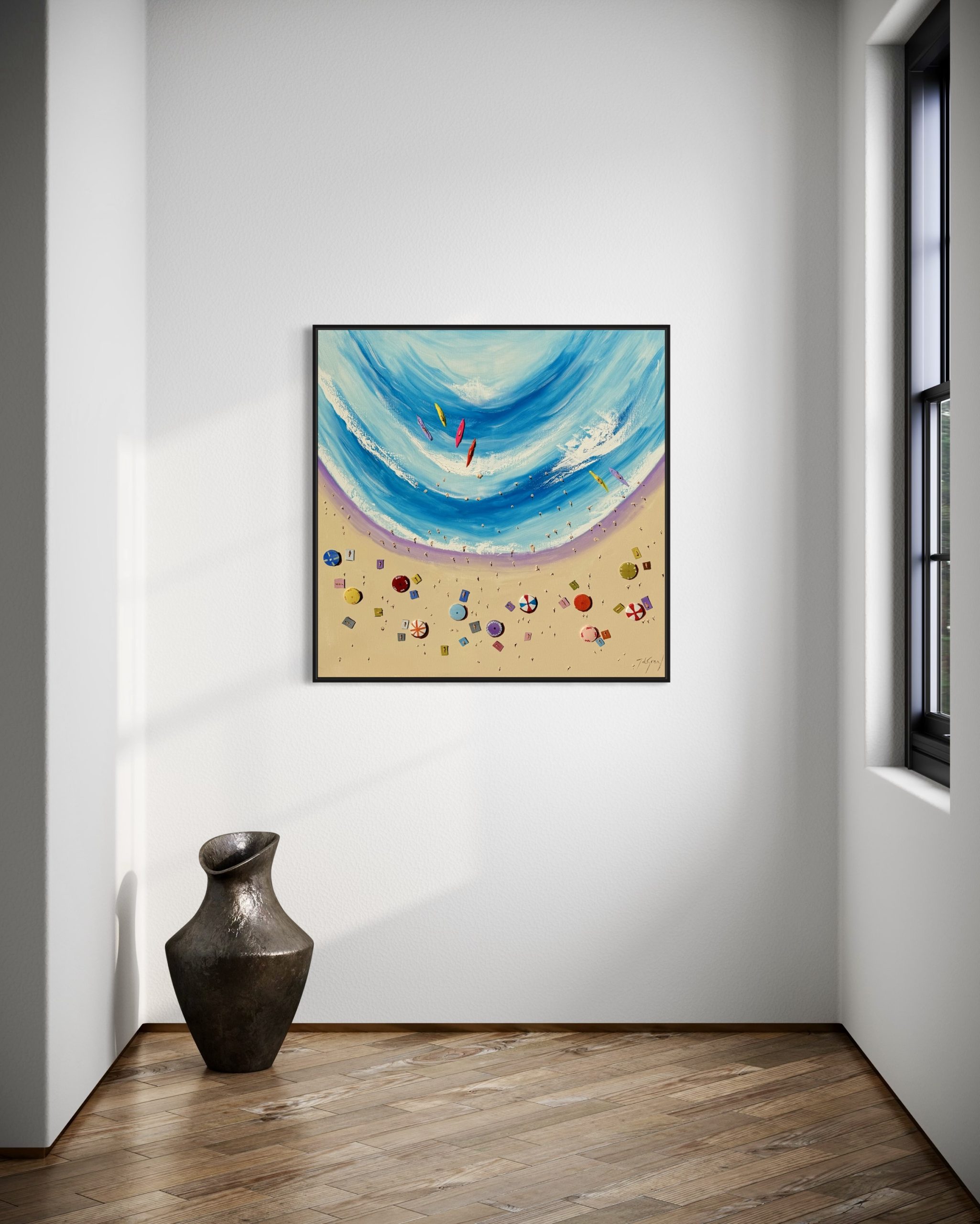 ‚On the beach I‘ ist ein atemberaubendes Kunstwerk aus der neuesten Serie des renommierten Künstlers Jochem de Graaf. Dieses Gemälde besticht durch seine sehr dicken Details, wie die Surfer, Figuren und Sonnenschirme, die einen beeindruckenden 3D-Effekt erzeugen. Diese besondere Dimension verleiht dem Gemälde ein lebendiges Aussehen, das in der Realität noch beeindruckender ist als auf Fotos.