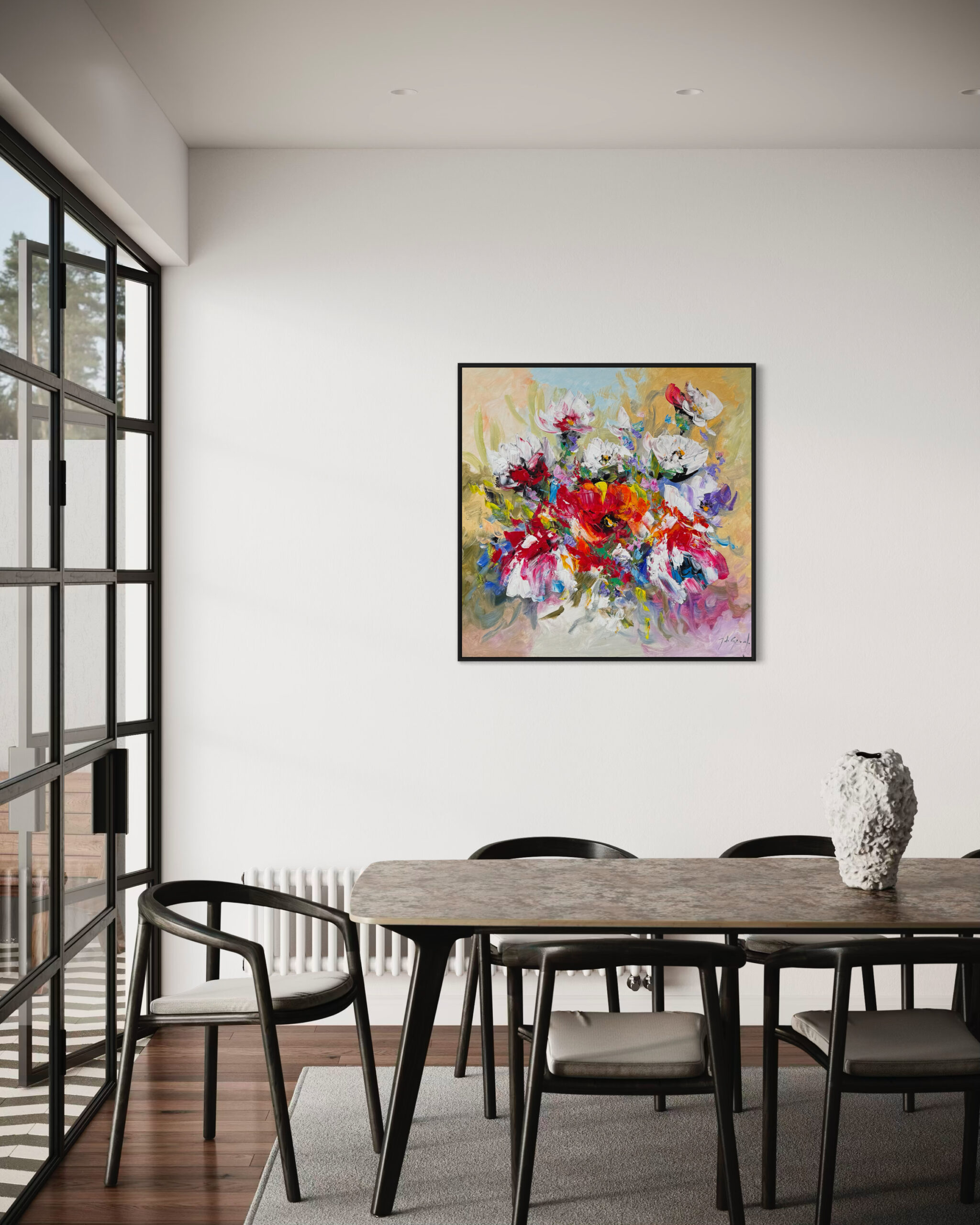 Wunderschönes Kunstwerk von Jochem de Graaf. Dieses Gemälde, offensichtlich ein Einzelstück, ist mit dicken Schichten von Ölfarbe auf Leinen gemalt, was ihm eine besondere Dynamik verleiht. Die Komposition der Blumen ist fast abstrakt, was dem Kunstwerk einen modernen Look verleiht. Es hat eine Größe von 100x1oocm und kann, da die Seiten durchgemalt wurden, im Handumdrehen an die Wand gehängt werden. Wir persönlich finden, dass ein schwarzer Rahmen sehr gut zu diesem Kunstwerk passt. Lassen Sie sich in unserer Galerie beraten. Dieses Kunstwerk ist in unserem Kunstverleih erhältlich und kann auch online gekauft werden. Die Lieferzeit beträgt ca. 1-3 Arbeitstage.