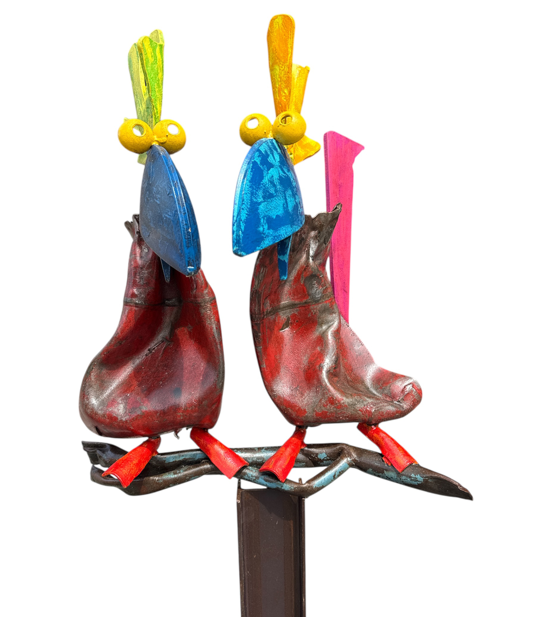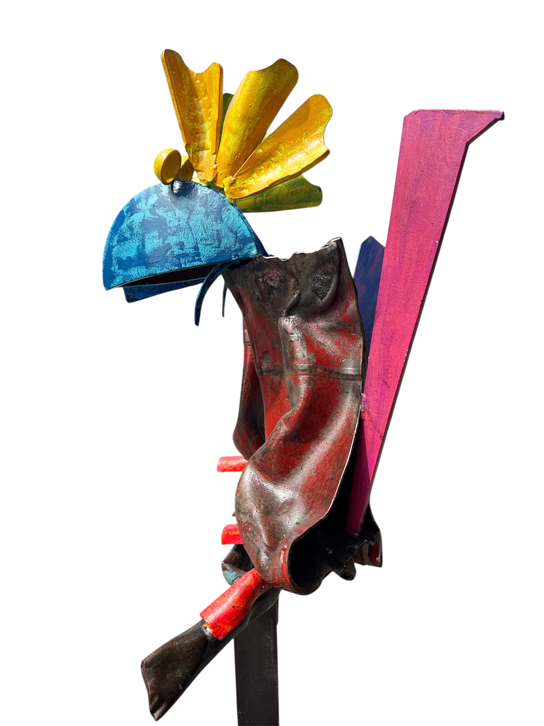 Jörg Ridderbusch ist bekannt für seine innovative Verwendung von recycelten Materialien, hauptsächlich Stahl. Er verwandelt Alltagsgegenstände wie Treppengeländer in majestätische Throne und fertigt aus Autofelgen wunderschöne Flügel für Vögel. Durch die Wiederverwendung dieser Materialien verleiht Jörg dem, was viele für kalt und leblos halten, Emotionen. Spielerisch verarbeitet er dieses kühle Material und kombiniert es mit bunten Fantasiefiguren, die direkt aus Märchen und Legenden zu stammen scheinen.