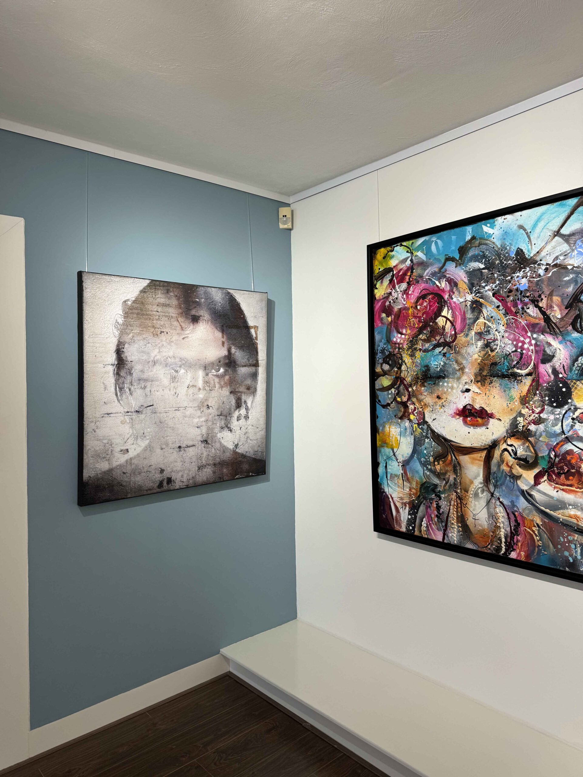 Karin erzählt von ihrem kreativen Prozess: "Meine Arbeit ist eine Verschmelzung von verschiedenen Fotografien/Bildern und Farbe, die ich am Computer und auf der Leinwand zu einer neuen Darstellung kombiniere. Mein Lieblingsthema ist das weibliche Gesicht. Ich verwende Fotos von Menschen und alten Mauern, Grunge-Poster und verschiedene andere fesselnde Motive, um jedes Mal ein neues Bild zu gestalten. Sobald der digitale Teil abgeschlossen ist, wird das Bild gedruckt und ich beginne zu malen. Ich baue das Kunstwerk mit verschiedenen Schichten von Texturen, Gelen und Farbe auf. Auf diese Weise versuche ich, das digitale Bild wieder greifbar zu machen. Bei meiner Arbeit geht es nicht so sehr um Erklärungen und Konzepte; sie ist ein Spiel und alles dreht sich um das Bild. Normalerweise beginne ich mit einer leeren Leinwand, aber wenn ich mir Bilder ansehe, die mich faszinieren, und sie kombiniere, entsteht nach und nach ein neues Bild. Alle Werke werden auf Anfrage in jeder Größe angefertigt. Die meisten dieser Werke sind eine Mischung aus Druck, Farbe, Körnergel, schwerem Gel und mattem oder glänzendem Firnis. Handgefertigt, ist jedes Werk individuell leicht unterschiedlich und wird in einer Auflage von bis zu 25 Stück, nummeriert und signiert, herausgegeben."