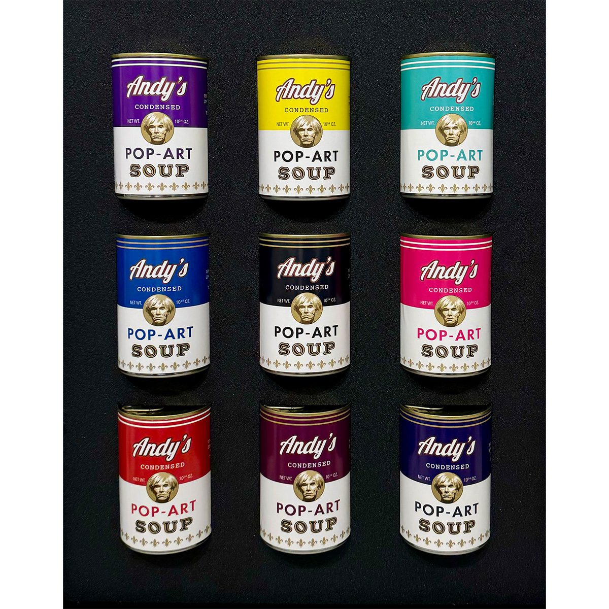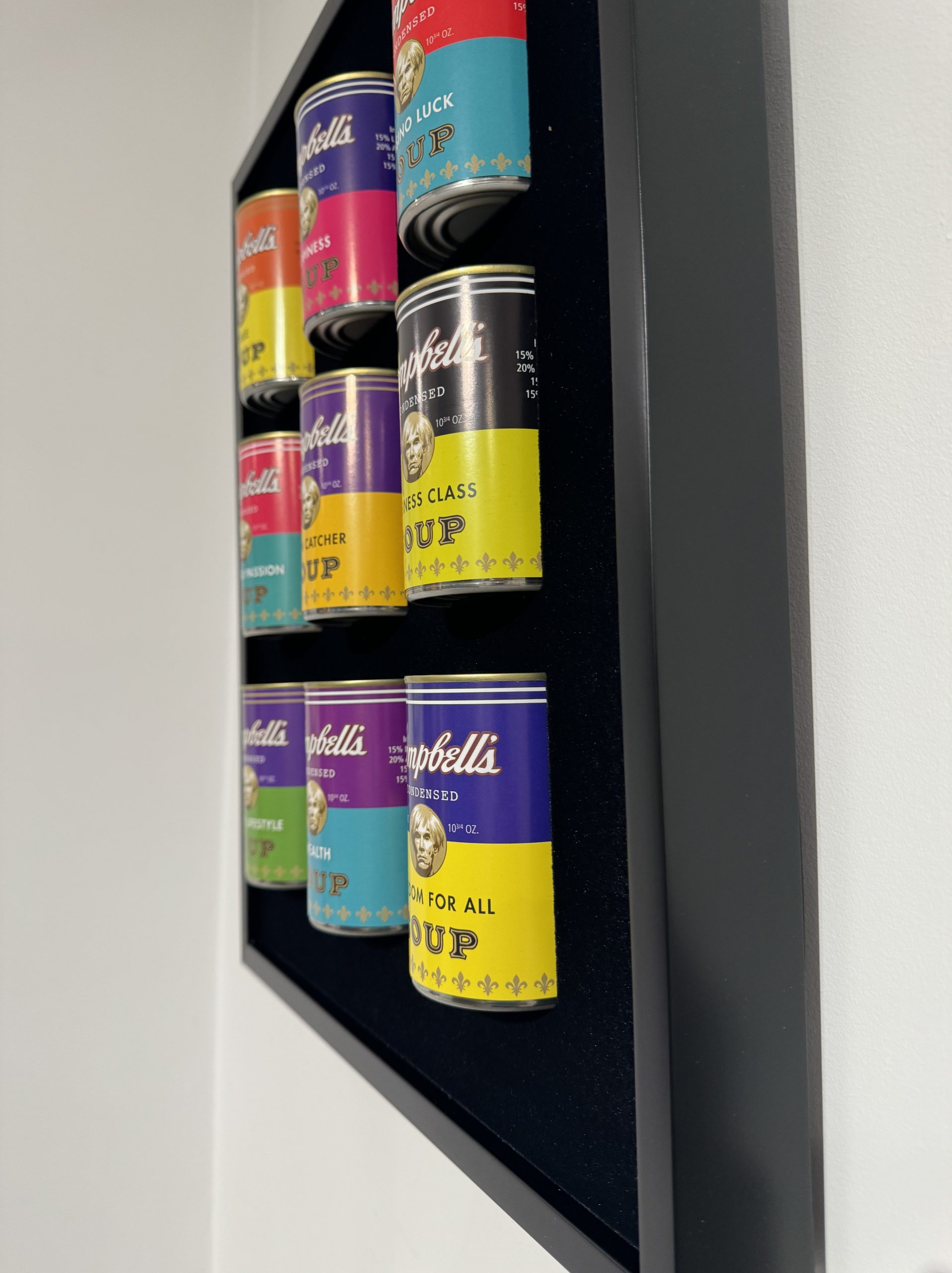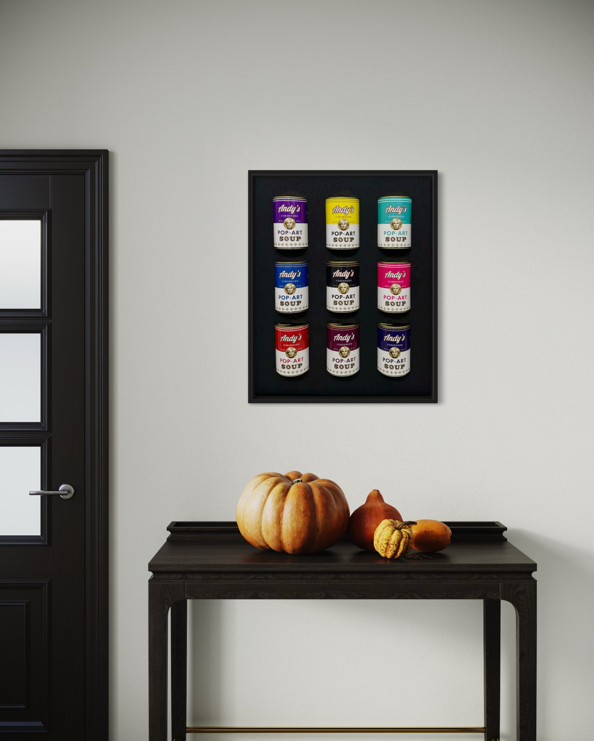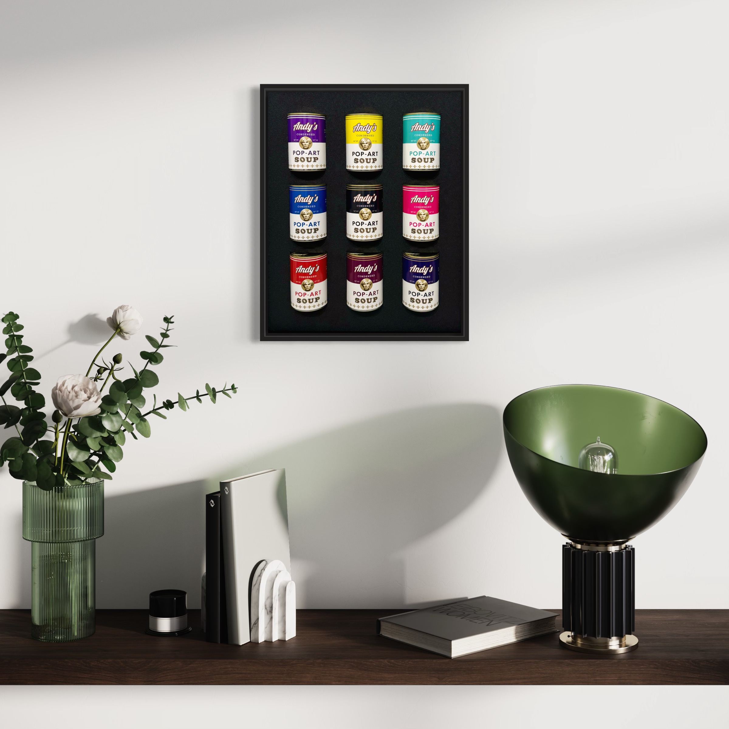 Entdecken Sie das einzigartige 3D-Objekt Andys Suppenfarbe, das der bekannte Künstler Ad van Hassel geschaffen hat. Dieses Kunstwerk ist eine Hommage an Andy Warhols ikonische Campbell-Suppendosen, eingebettet in dicken, schwarzen Schaumstoff und gerahmt in einem modernen, eleganten, mattschwarzen Rahmen. Der Rahmen hat eine Tiefe von 6 cm, was dem Ganzen eine beeindruckende Dimension verleiht.