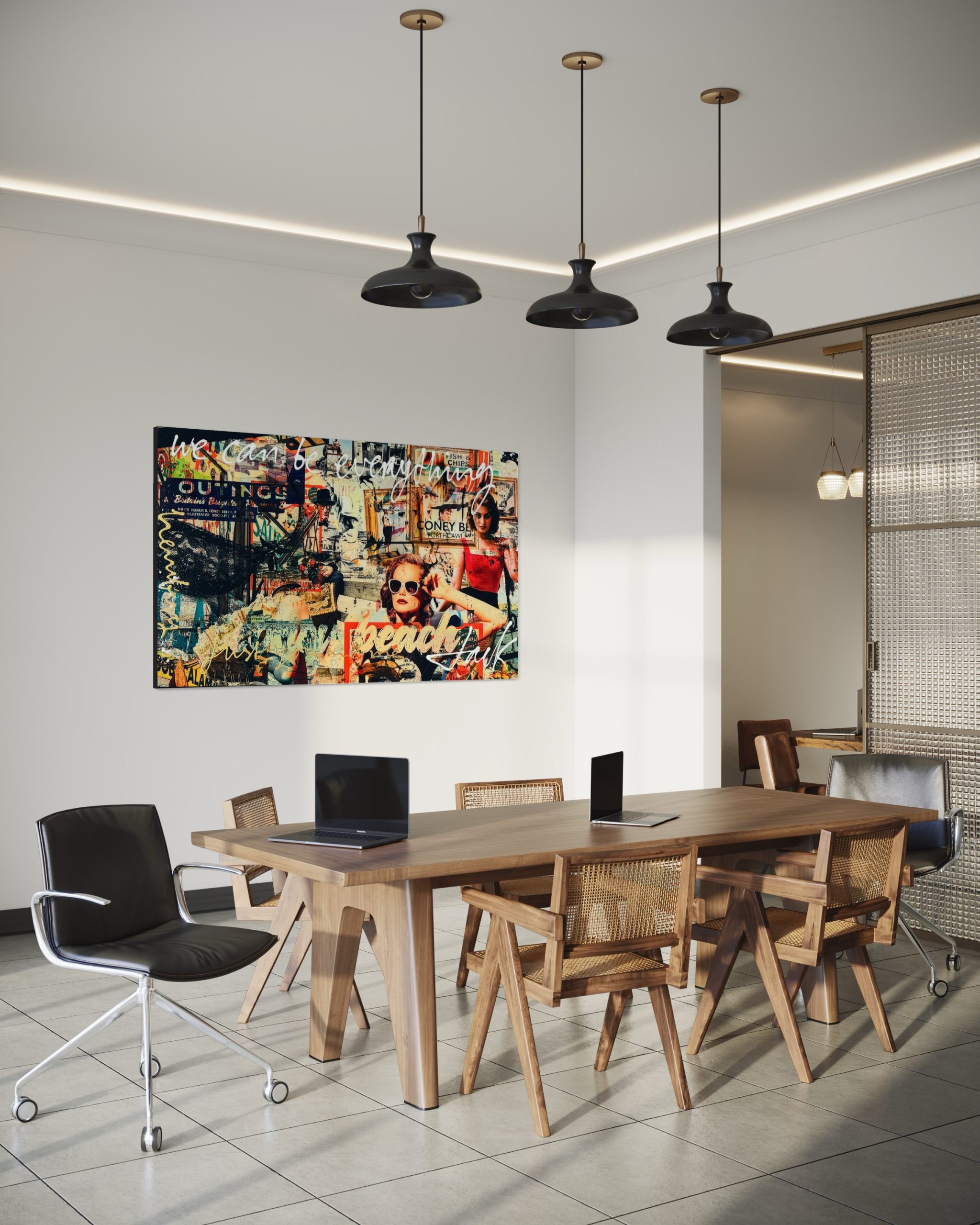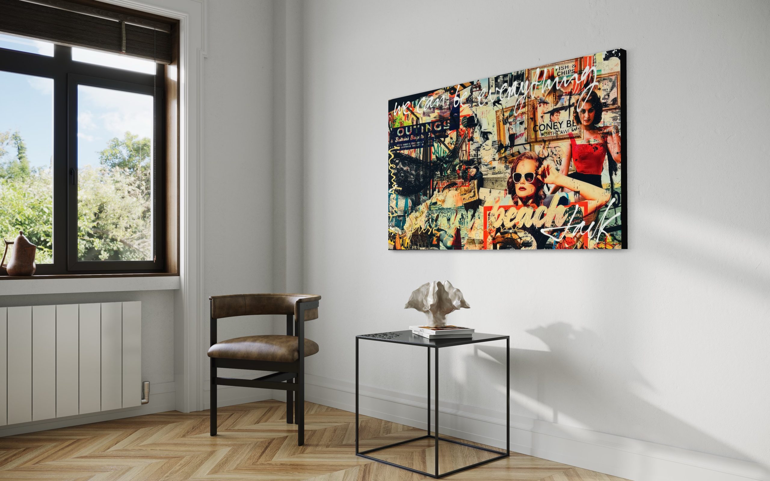 Coney Island", der berühmte Strand in Brooklyn, New York, und einer der bekanntesten Strände der Vereinigten Staaten, diente als Inspiration für dieses besondere Kunstwerk von Jack Liemburg. Dieses Werk ist eine einzigartige Kombination aus Fotografie, Acryl und Collagetechniken, die zusammen ein wunderbar nostalgisches Gefühl der 1960er Jahre hervorrufen. Die unverwechselbaren Pastelltöne und Schriftarten machen den Charme dieses Kunstwerks aus.
