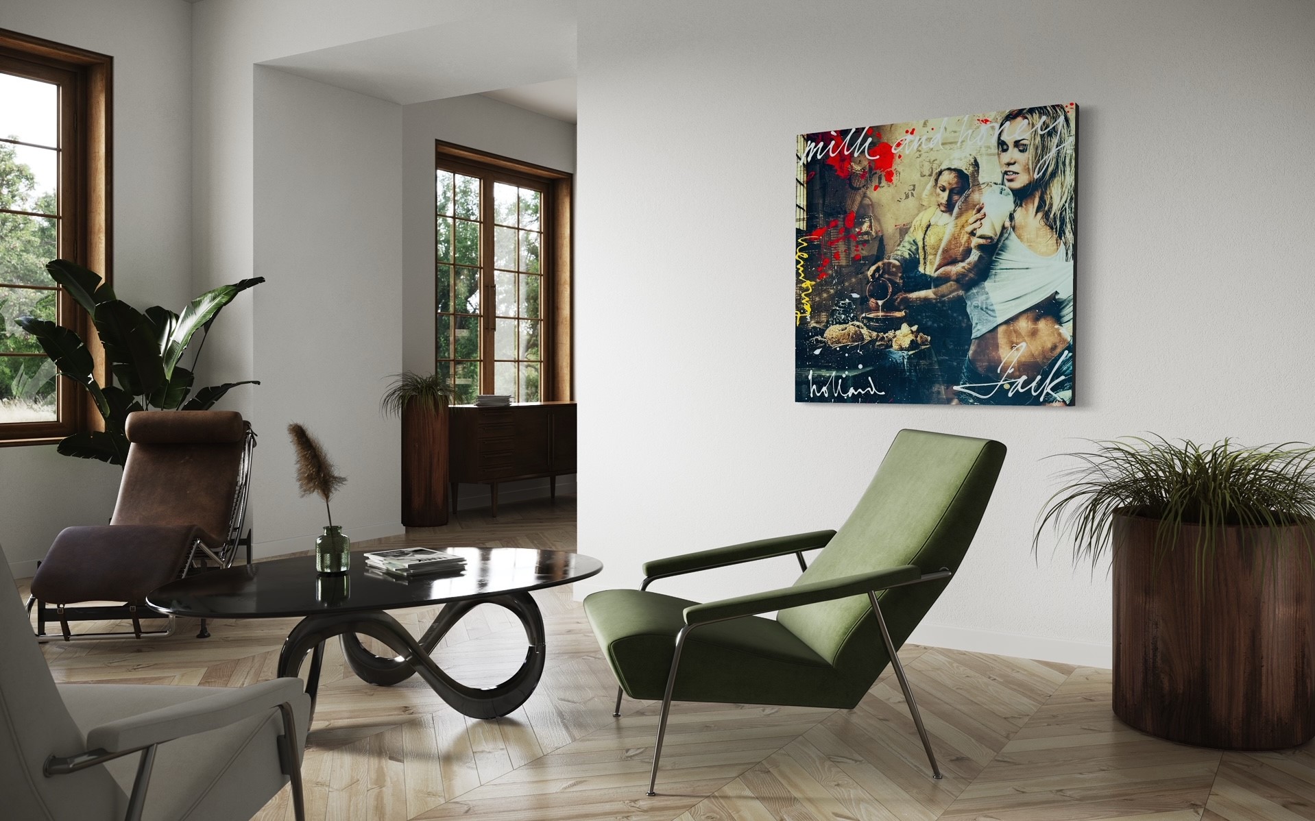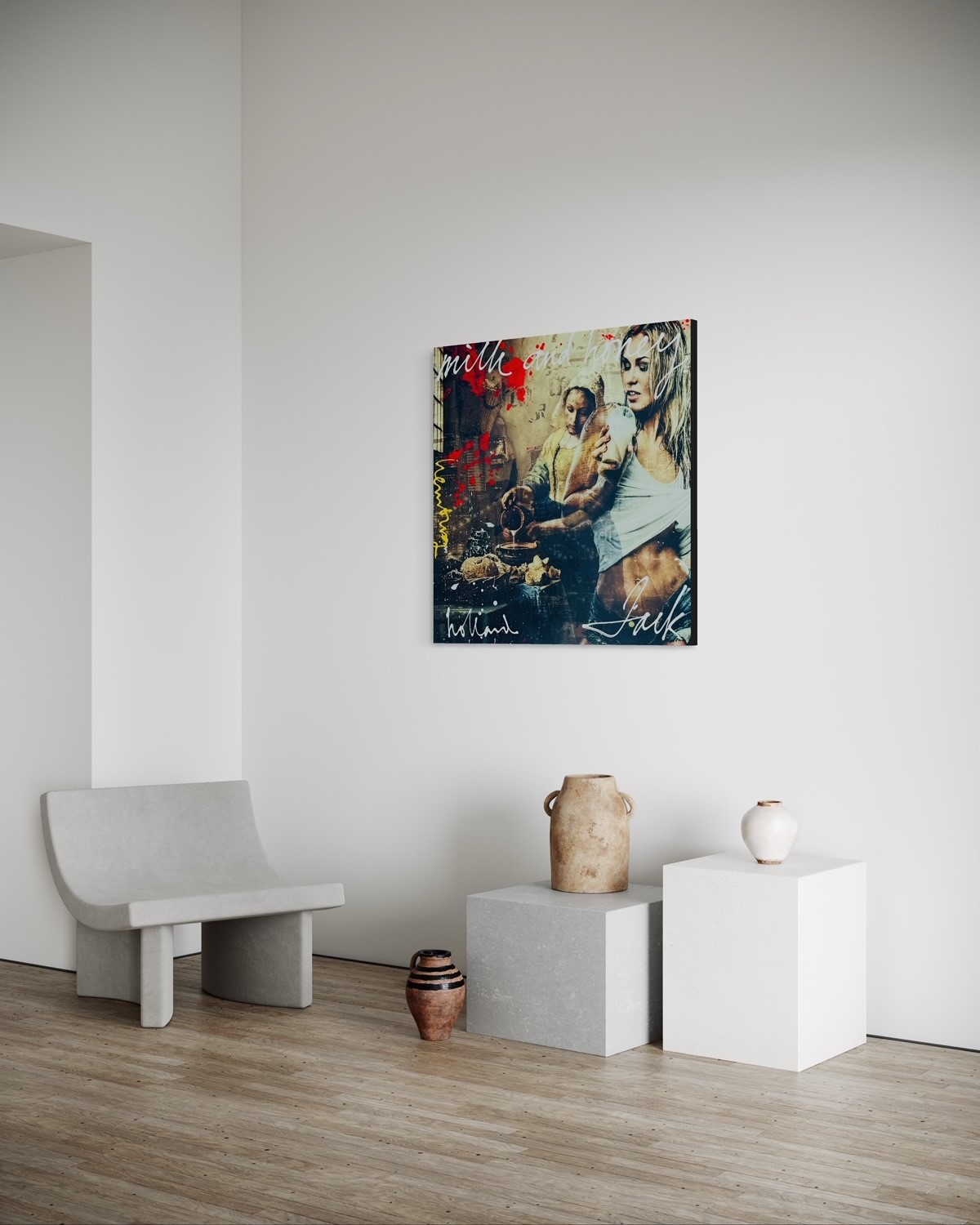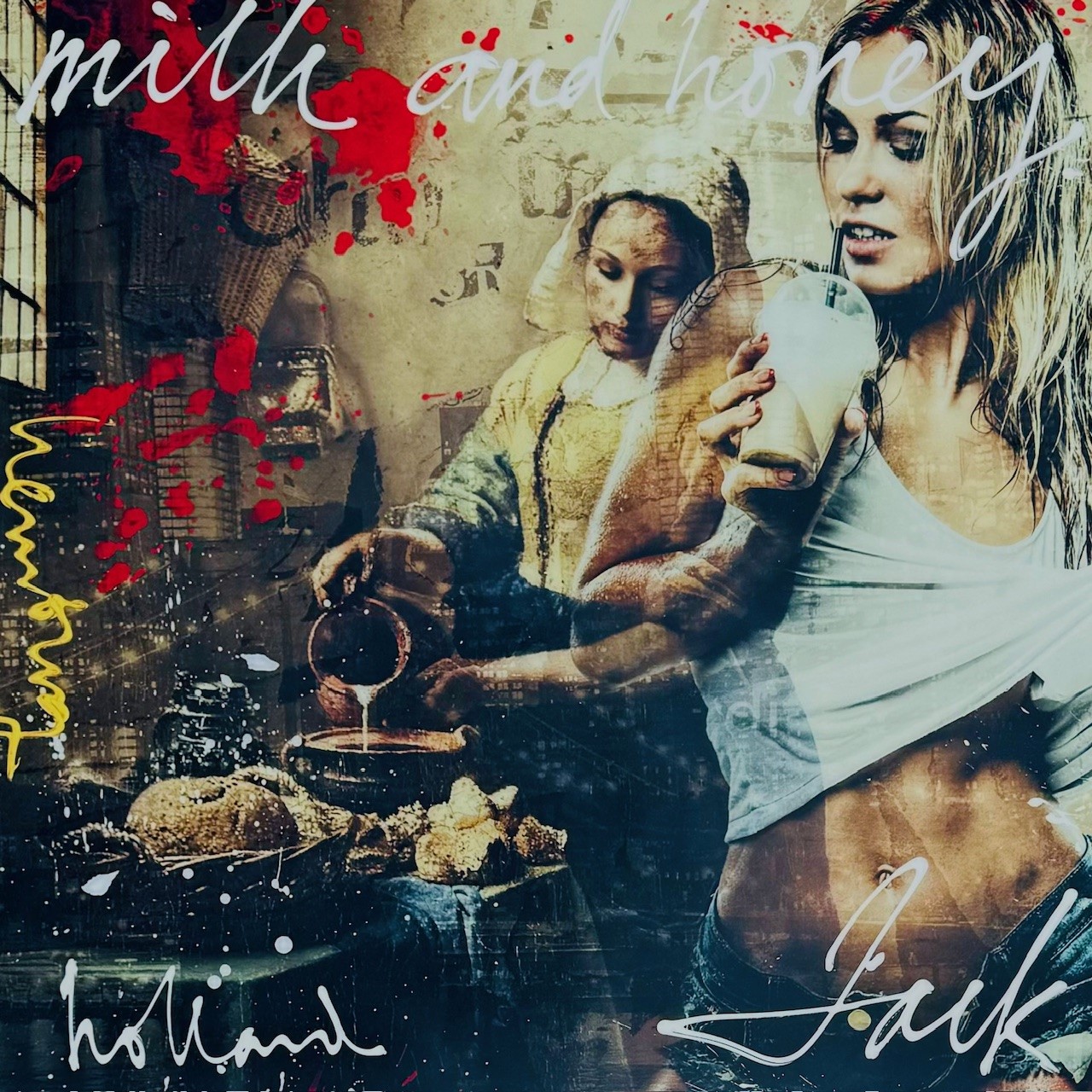 ‚Milk & Honey‘ ist eine beeindruckende Ode an Johannes Vermeers Die Milchmagd. Dieses Kunstwerk kombiniert Fotografie, Acryl und Collagetechniken auf besondere Weise. Es ist auf Dibond gefertigt und mit einem stabilen, 5 cm dicken Holzrahmen versehen, dessen Seiten durchgemalt sind. Dadurch ist das Kunstwerk sofort bereit, an die Wand gehängt zu werden.